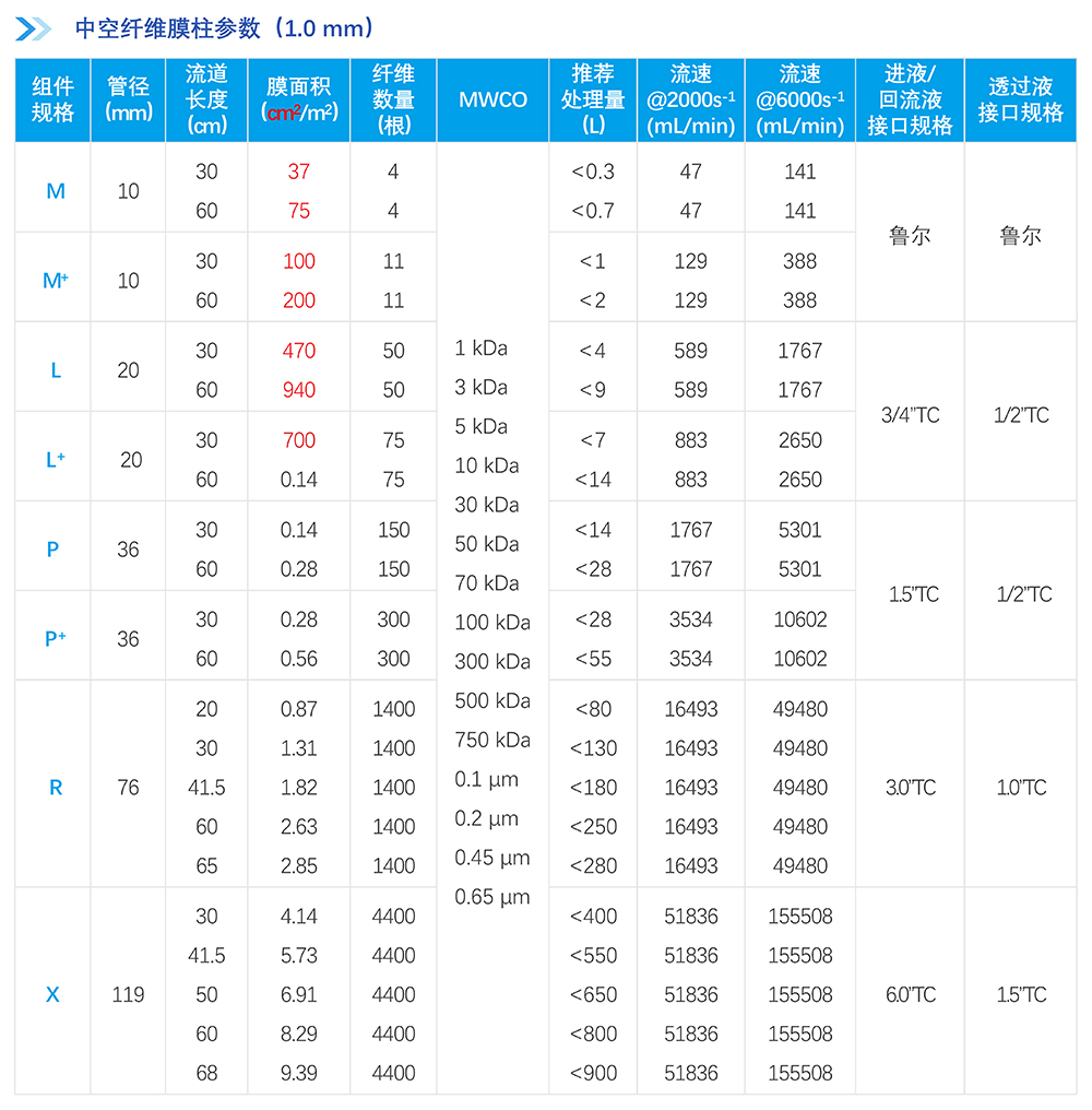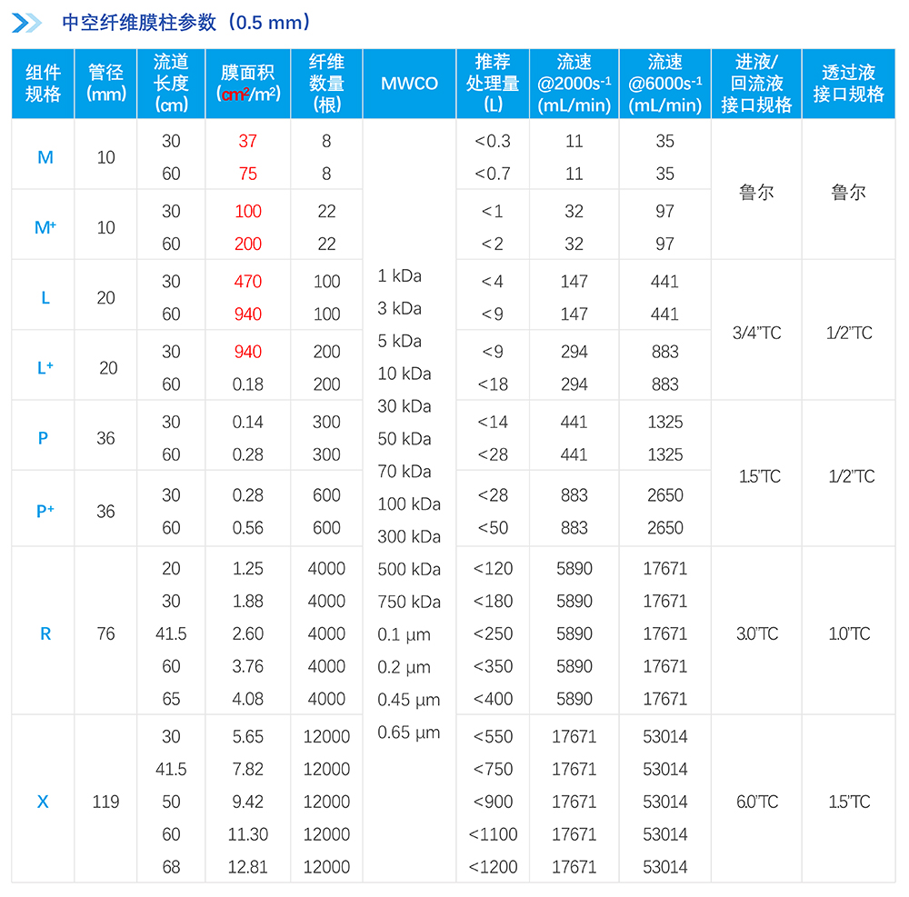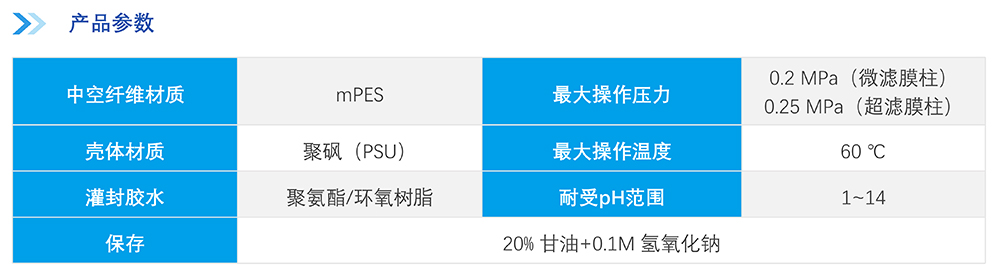 中空纤维膜丝采用改性聚醚砜(mPES)制备,抗污染性能强;非对称梯度孔结构及均一孔径保证高过滤精度的同时能获取更高通量,提高产品收率。中空纤维膜柱采用符合医疗级别的外壳材料,生物相容性优异,在灭菌环境中稳定性杰出;选用的胶黏剂粘接强度高,耐热性、耐化学性及生物相容性杰出;同时采用改善的注胶工艺,注胶精度高,产品无缺陷。